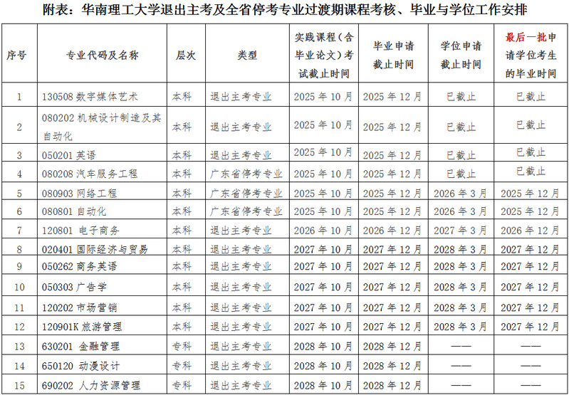 根据《关于华南理工大学等11所高校不再担任高等教育自学考试相关专业主考学校的通知》(粤考委〔2022〕4号)《关于深圳大学等3所高校不再担任高等教育自学考试相关专业主考学校的通知》(粤考委〔2023〕2号)《关于调整我省高等教育自学考试部分专业主考学校的通知》(粤考委〔2024〕4号)《关于调整我省高等教育自学考试部分专业主考学校的通知》(粤考委〔2025〕1号)文件,我校机械设计制造及其自动化等9个本科专业及金融管理等3个专科专业为退出主考学校专业。根据《关于停考我省高等教育自学考试税收学等23个专业的通知》(粤考委〔2022〕2号)文件精神,我校汽车服务工程(本科)等3个专业为全省停考专业。